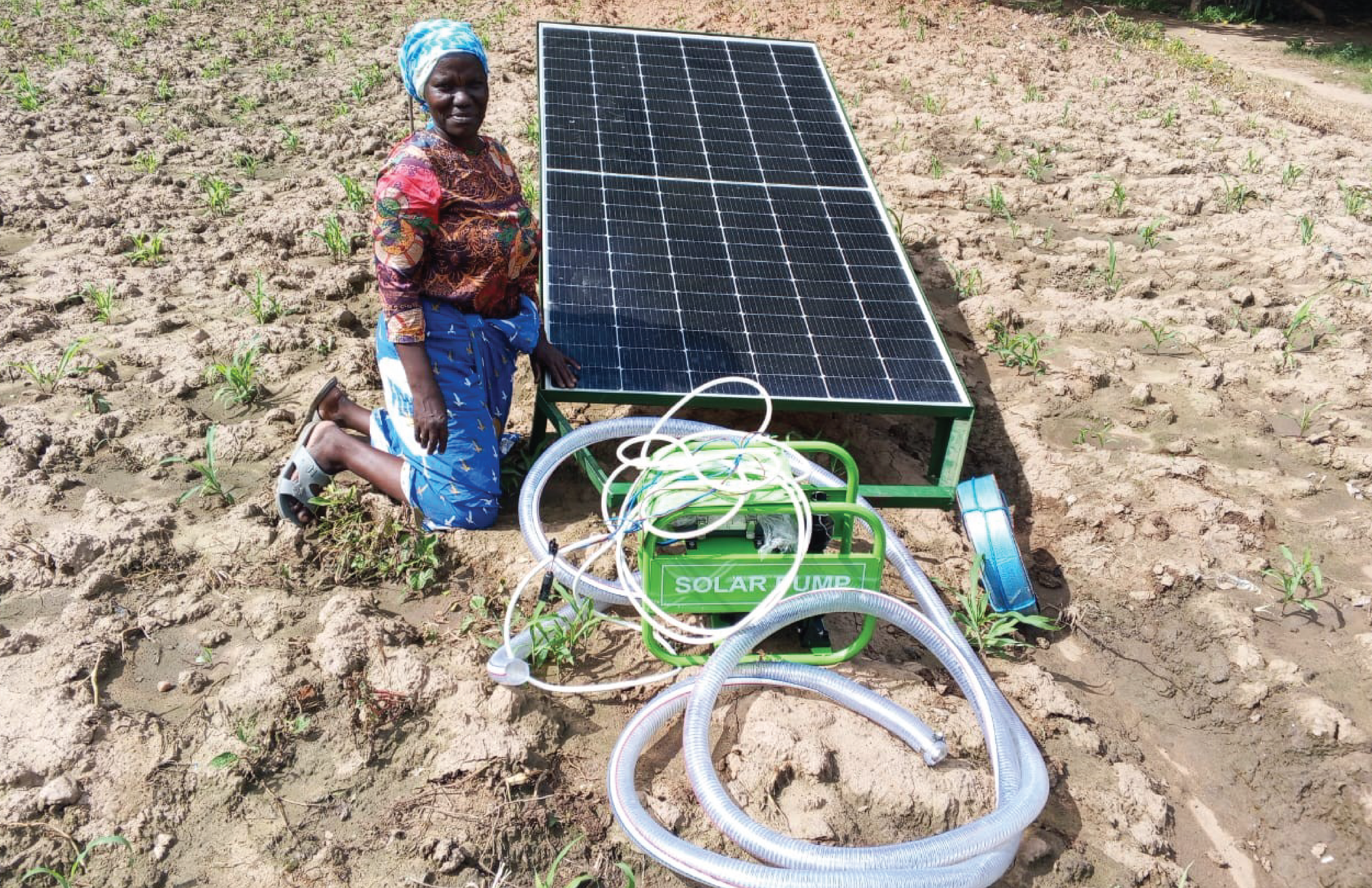4 solar panels (455 watts each), surface solar water pump (50,00 litres per hour), 3inch delivery pipe (100meters), 3inch sanction (10 meters) and PV electric cables (10 meters).